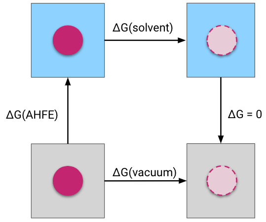 The absolute solvation free energy is calculated through a thermodynamic cycle. In this cycle, the interactions of the molecule are decoupled, meaning turned off, using a partial annihilation scheme (see below) both in the solvent and in the vacuum phases. The absolute solvation free energy is then obtained via summation of free energy differences along the thermodynamic cycle.