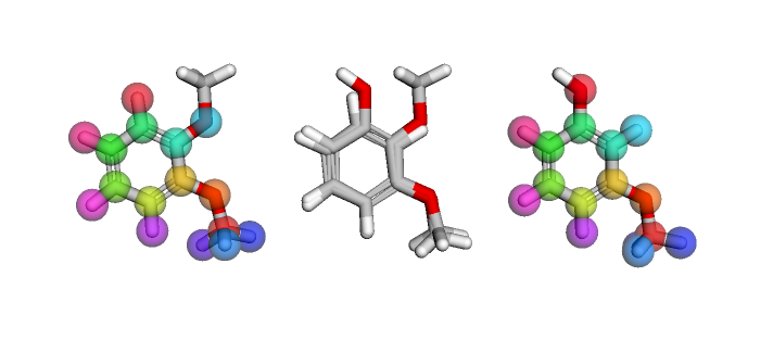 The centre view shows both molecules overlaid, allowing the spatial correspondence to be directly viewed.